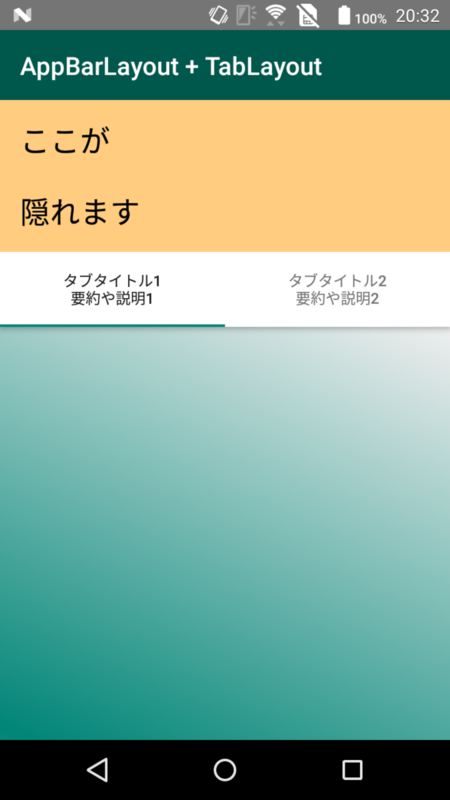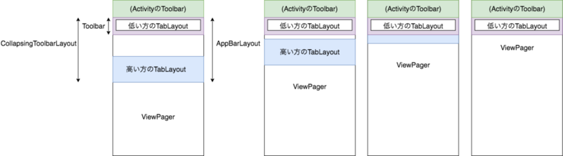このようにレイアウトを組むと、初期状態からスクロールしていくと高い方のタブが低い方のタブの下に隠れて、最終的に低い方のタブが最上部に固定されたままViewPagerのコンテンツをスクロールできます。