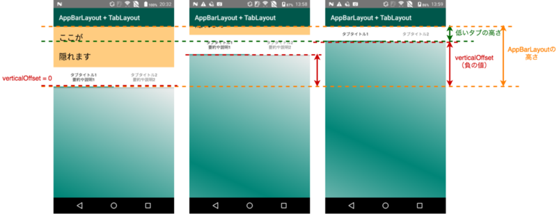 「AppBarLayoutがスクロールし切った状態」を検出するには、AppBarLayout.addOnOffsetChangedListener(AppBarLayout.OnOffsetChangedListener)を利用します。AppBarLayout.OnOffsetChangedListenerをセットすると、AppBarLayoutがスクロールする度にonOffsetChanged(appBar: AppBarLayout?, verticalOffset: Int)が呼ばれます。verticalOffsetはAppBarLayoutの初期位置で0になり、上にスクロールされると移動分の負のpx値が渡されてきます。下の図のように、「AppBarLayoutの高さ+verticalOffset == 低い方のタブの高さ」となった時が、ちょうどAppBarLayoutがスクロールし切って低い方のタブだけが表示された状態となり、そのタイミングで高い方のタブと低い方のタブの可視性を入れ替えるとうまくいきます。AppBarLayoutとTabLayoutの高さ(px)はheightで取得できます。