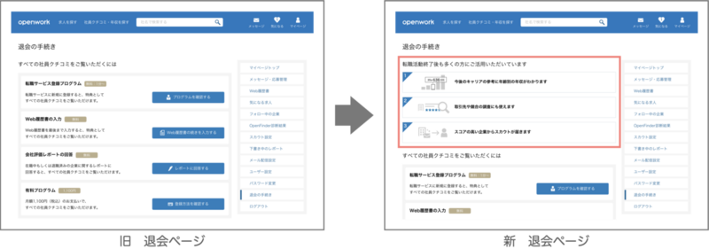 私にプロジェクトで一番初めに割り振られたタスクは、OpenWorkの退会ページで退会防止の訴求文言と画像を表示する、というものでした。