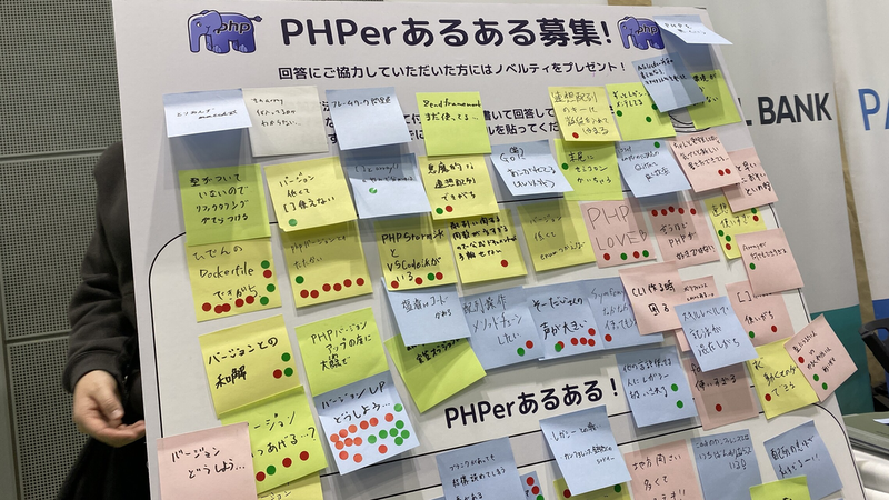 例えばBASEさんのブースでは、「PHPerあるある募集」のボードにPHP開発者が思い思いの「PHPあるある」を並べていました。