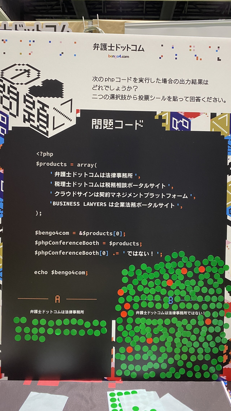 弁護士ドットコムさんのブースでは、「PHPコードを実行した場合の出力結果」を2択で問う問題が展示されておりました