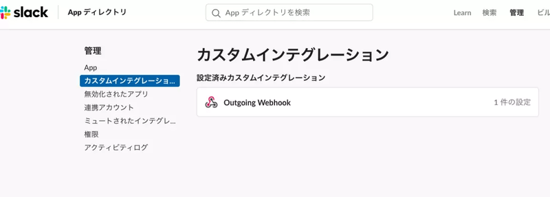 slackの設定画面に行き、カスタムインテグレーションからOutgoing Webhookを探して追加します。