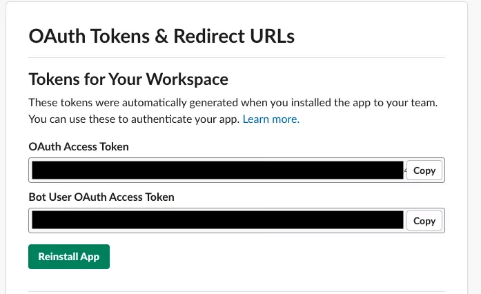 作成出来たら、OAuth & Permissionsにアクセスし、Bot User OAuth Access Tokenの方をメモしておきます。